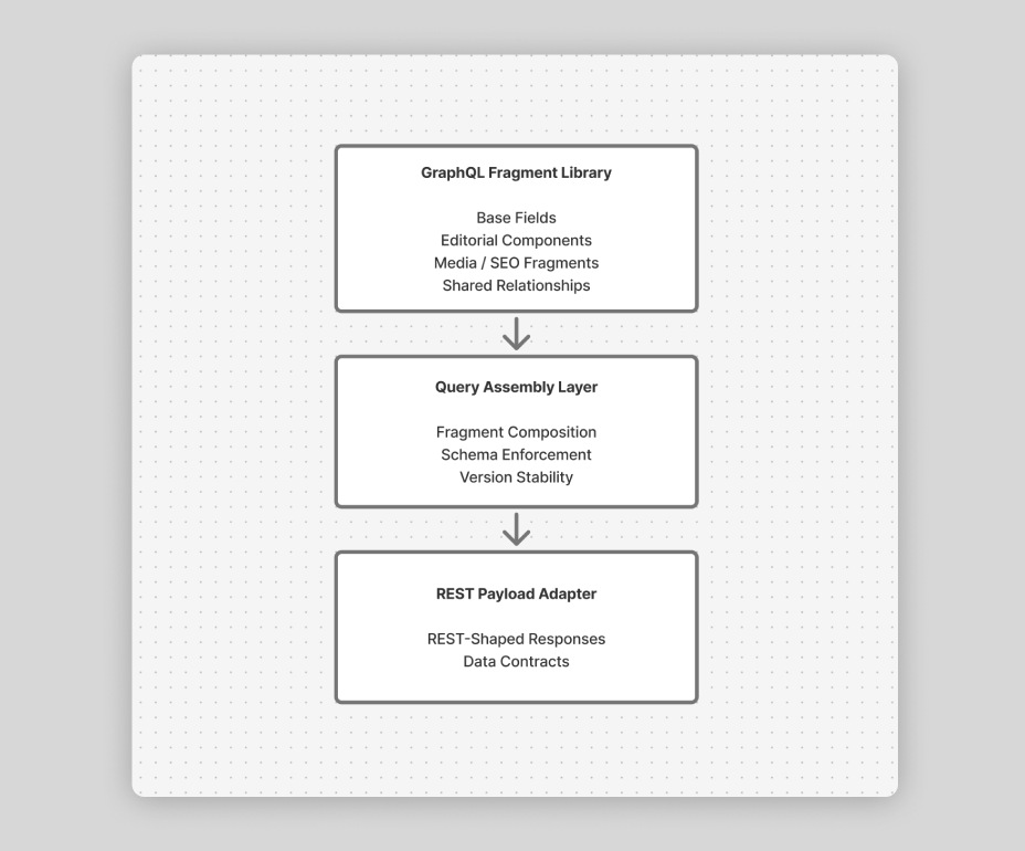 Although our downstream consumers use REST, many still needed highly structured and predictable data. I built utilities that assemble fragments into REST-shaped payloads, making GraphQL modularity work seamlessly in our API layer.