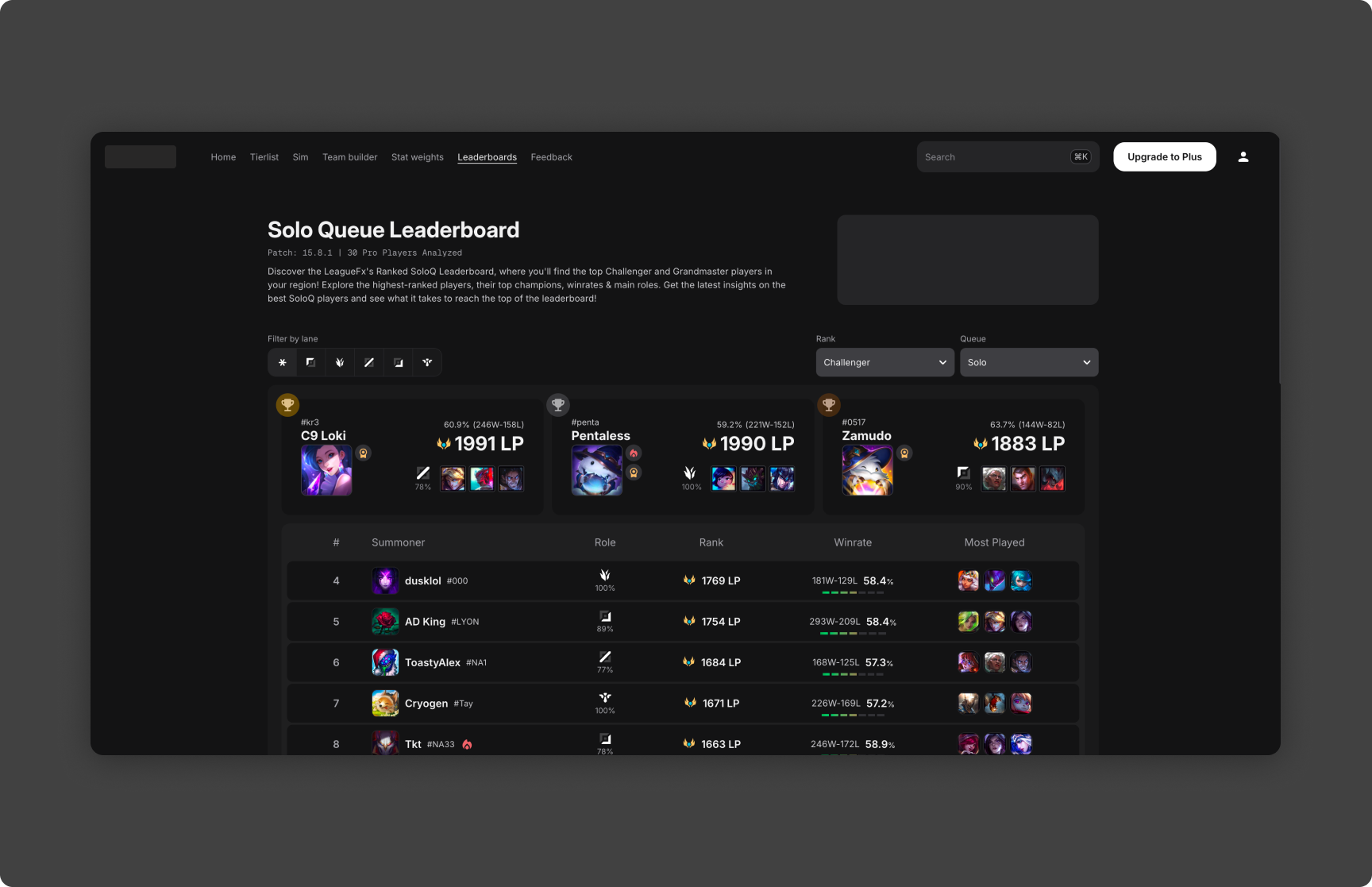 Champions are grouped into tiers based on metric thresholds, making it easier to interpret relative strength without relying solely on raw rankings.