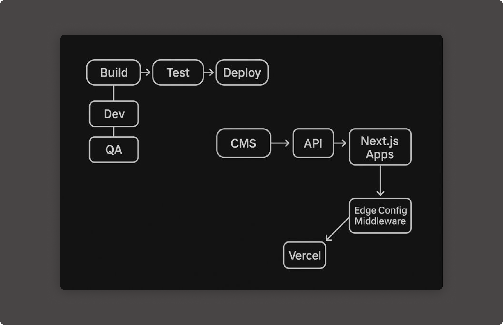My work focused on rebuilding the platform from the ground up using Next.js, Vercel, GitHub Actions, Playwright, and a set of internal tools that streamlined the entire delivery pipeline.